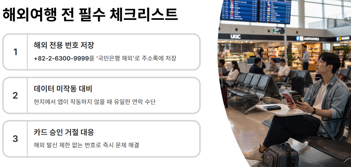 특히 해외여행을 계획 중이라면 +82-2-6300-9999 번호를 휴대폰 주소록에 '국민은행 해외'라는 이름으로 미리 저장해 두시기 바랍니다. 현지에서 데이터가 터지지 않거나 앱이 작동하지 않을 때, 이 번호 하나가 든든한 보험이 되어줄 것입니다.