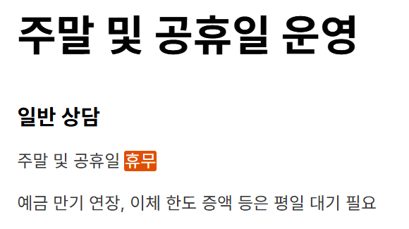주말과 공휴일(대체공휴일 포함)에는 일반 상담 업무를 하지 않습니다. 예금 만기 연장이나 이체 한도 증액 같은 업무는 평일을 기다려야 합니다.